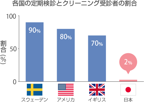 特に右のグラフを見てみると、歯科先進国でもあるスウェーデンと日本の残存数の違いは歴然です。会話や食事をずっと楽しむためには、メンテナンス・予防ケアをしっかりと行い、できるだけ長く自分自身の歯を維持することが大切と言えるでしょう。